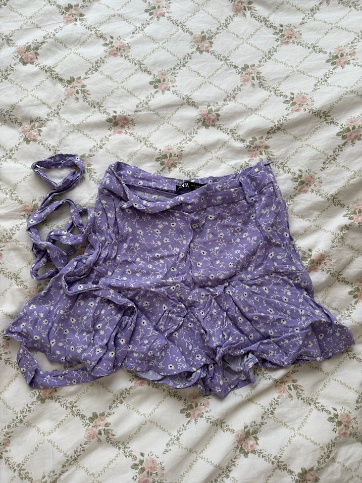 Yumuşak keten kumaştan, bağcıklı, fırfırlı ve bağlama desenli, bol kesim pastel mor mini etek. Günlük kullanıma uygun bohem tarzda.
