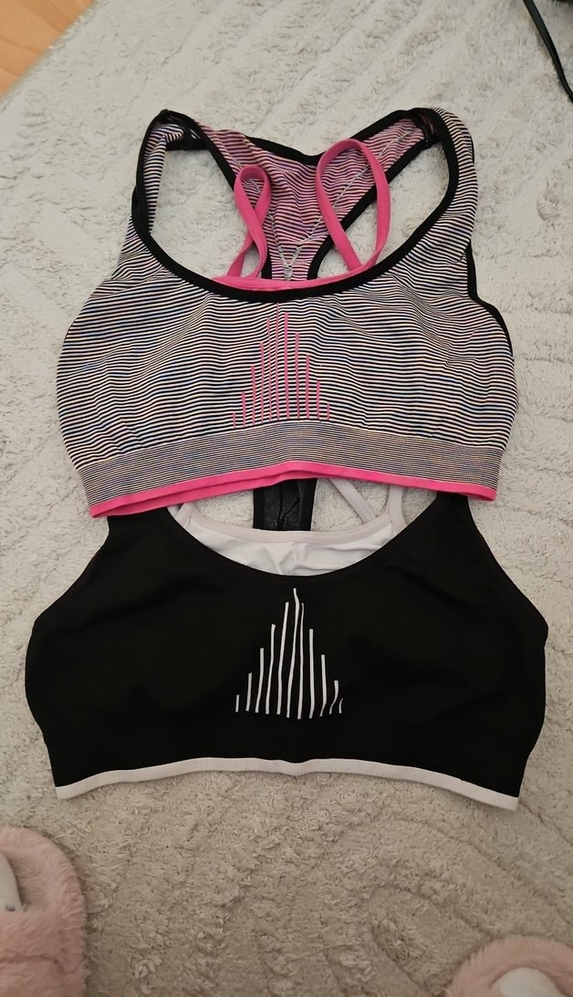 Koyu pembe ve siyah renklerde, kısa kesim, çizgili ve kontrast detaylı iki spor sütyeni. Rahat ve sokak tarzına uygun. ️♀️