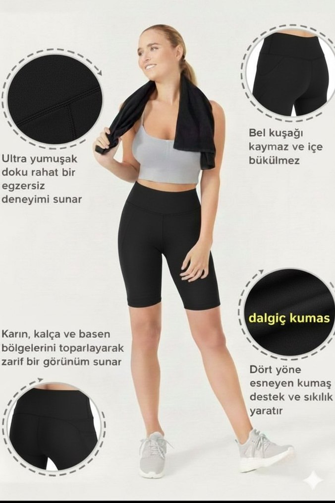MARKA TEMSİLİDİR Spor yaparken, yürüyüşte veya günlük kombinlerinde rahatlığı ve şıklığı bir arada yaşa! Bu kısa tayt; yüksek bel toparlayıcı tasarımı sayesinde vücudu sararak fit bir görünüm sağlar. ✨ Özellikler: Yüksek bel: Karın bölgesini toparlar, ince bir siluet oluşturur. Enine ve boyuna likralı kumaş: Maksimum esneklik ve hareket özgürlüğü sunar. Dalgıç kumaş yapısı: Dayanıklı, esnek ve vücuda tam oturur. Renk seçenekleri: Siyah • Haki • Gri • Lacivert Bedenler: S • M • L • XL