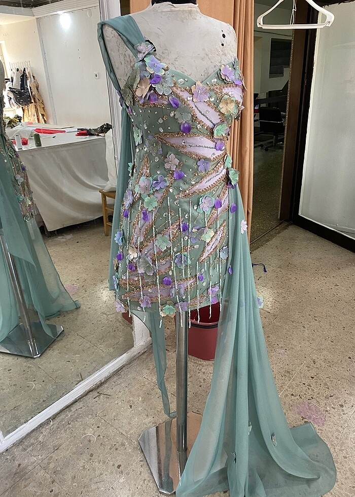 Şifon ve saten kumaş, üç boyutlu çiçek ve el işlemesi detayları olan kısa tasarım abiye, istenilen ölçülerde dikim yapılır