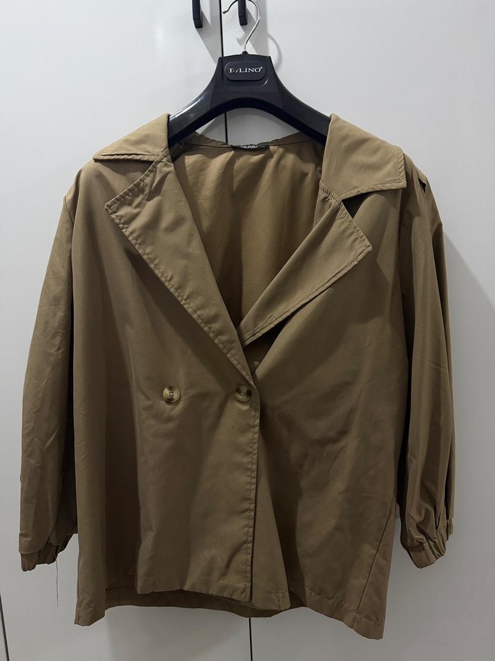 Hiç giyilmemiş, etiketsiz yeni bir ürün. Kısa kesimli, kruvaze düğme detaylı hafif bir mont. Yaka kısmı geniş ve dökümlü, kol uçları hafif büzgülü lastikli yapıda olduğu için modern bir duruş sağlıyor. Bej-kahve arası “cappuccino” tonda doğal bir renge sahip ve günlük kombinlere rahatlıkla uyum sağlar. İnce mevsimlik kumaştan üretildiği için hem baharlık hem hafif serin havalarda ideal.Standart beden.Dolabımı yenilediğim için hiç giymeden elden çıkarıyorum.