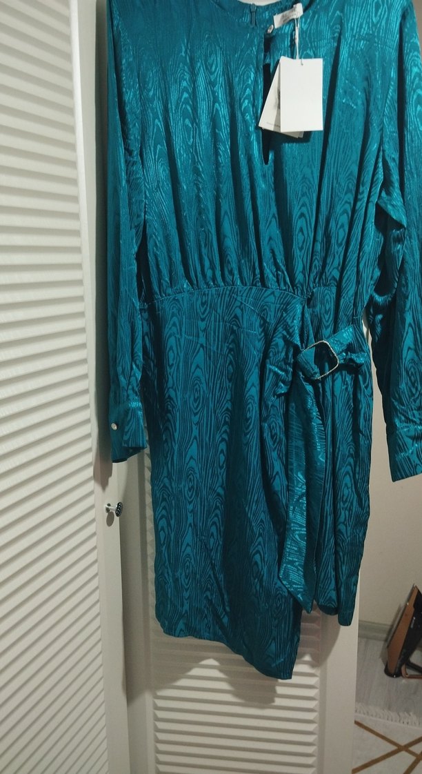 diz boy turkuaz renkli, bağcıklı kollu ve bol kesim bohem stilde elbisedir. Belinde kemer detayı bulunmaktadır.