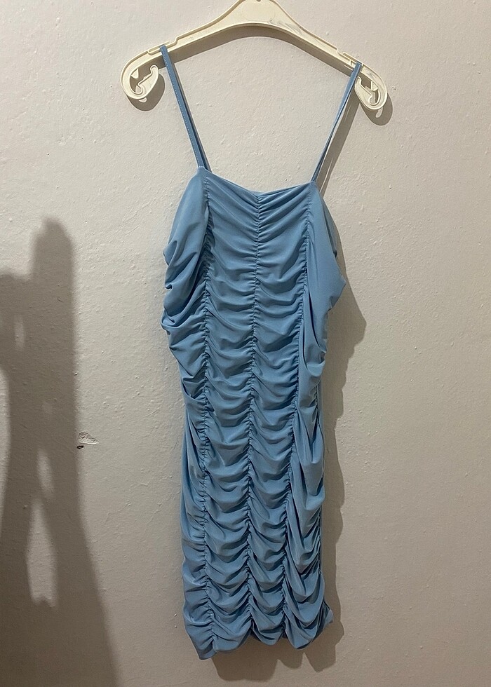 Kısa esnek kumaş mavi elbise bir kez giyildi defosu yoktur