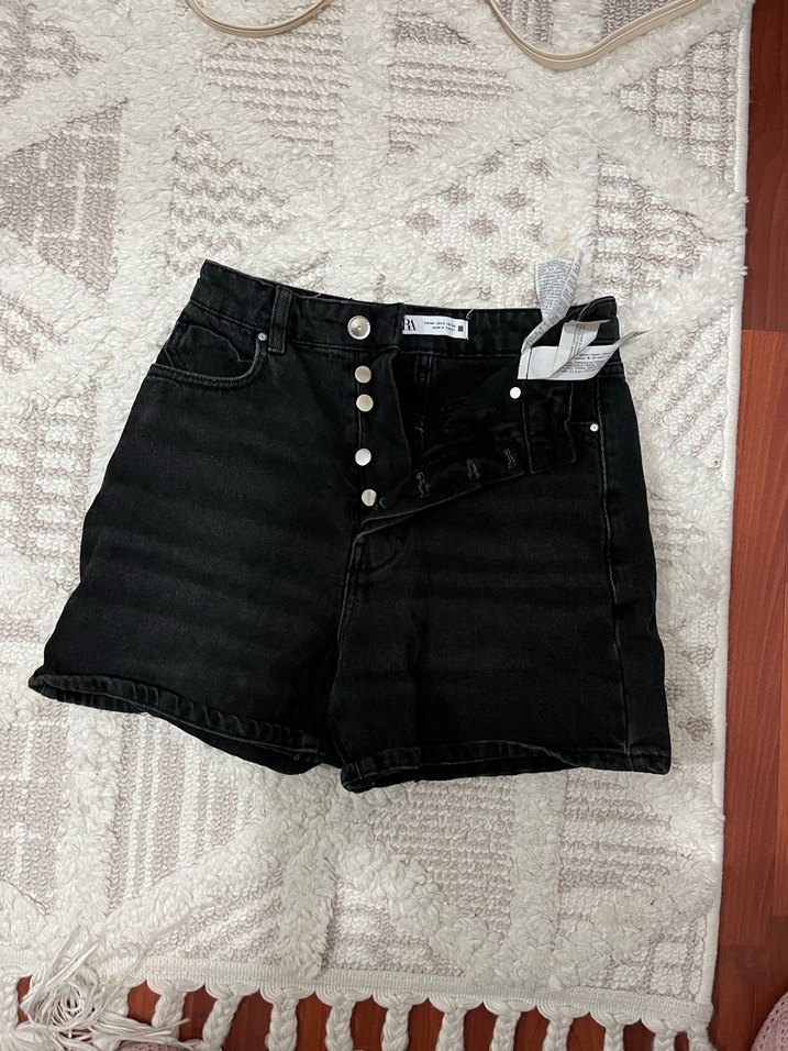 Düğmeli, bol kesim siyah kot şort, kısa boy ve sade tasarımıyla günlük sokak tarzına uygundur.