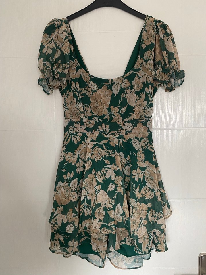 Koyu yeşil çiçek desenli bu mini elbise, volanlar, V yaka ve kısa balon kollara sahiptir. Gevşek kesimi ve vintage bohem. Şortlu ve şık sırt detaylı hiç sorunu yok