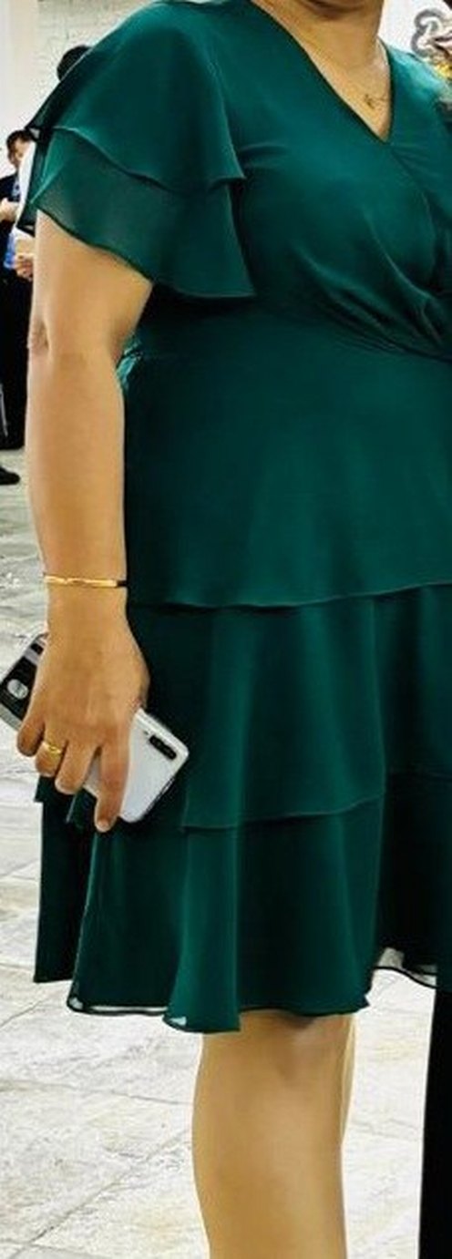 Kısa yeşil ve şifon kumaştan, v yaka ve drapeli abiye elbise. Düğünler için uygun, klasik şıklık sunar. ✨ Ben 75 kilo 155 boydayım