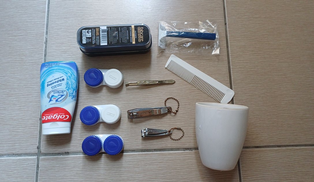 bazıları hafif kötü durumdalar sadece tırbak makasları sağlamlar ve çok iyi iş görüyorlar cımbız çok güzel alıyor solingen in çok sağlam pas vs yok harika cımbızdır, banyo için düz beyaz bardak, 3 adet temiz lens kutusu ,colgate yarıya kadar dolu diş macunu tarihi geçmemiştir bir kez kullanılmış yeni gibi ayakkabı parlatıcısı tavsiye ederim yeni gibi kutusunda,beyaz banyo tarağı,ve hiç açılmamış derby jilet paketin içerisindedir herşey yeni gibidir tırnak makaslarında pas vardır lütfen belirtilmedi demeyin✨️