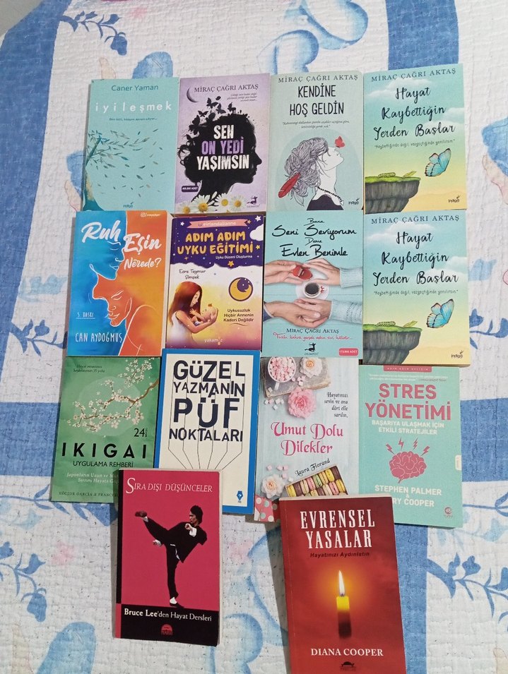 İlgilendiğiniz kitaplar için yazin yardimci olayim . . Stres yönetimi, iyileşme, yazma ipuçları ve evrensel yasalar gibi konuları içeren kişisel gelişim ve ruhsal kitaplar seti.