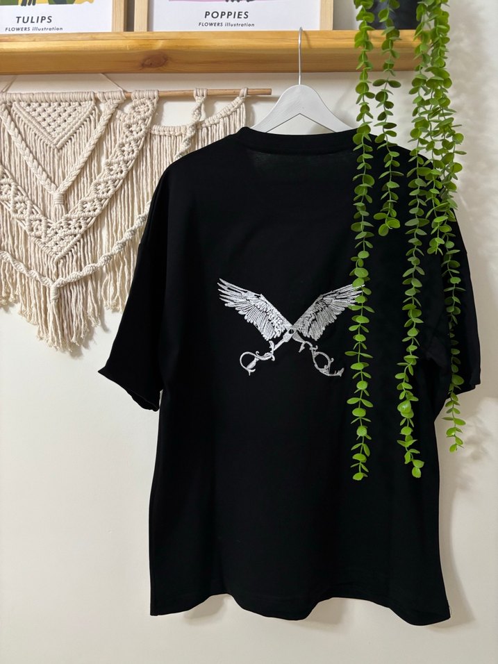 Siyah, kısa kollu, yuvarlak yakalı, pamuklu, baskılı ve drapeli loose fit hamile tişörtü. Günlük kullanım için uygundur. İstenilen model yapılır iletişim için roseemborideryy yazabilirsiniz