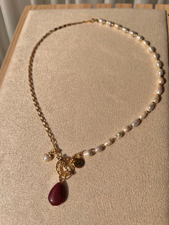 Orijinal tatlı su incisi, yakut görünümlü celt kuvars taşı ve 14K kaplama detaylarla hazırlanmış kişiselleştirilebilir el yapımı kolye.