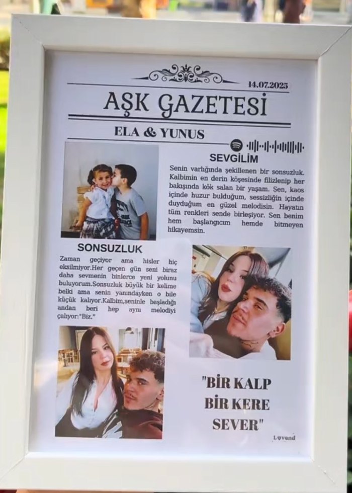 Sevdiklerinize özel, tamamen kişiye göre hazırlanan Aşk Gazetesi Tasarımı! Fotoğraflarınız,isimleriniz bulunduğu başlık ve seçtiğiniz şarkının spotify kodu ile sizin tercihinize göre eklenir. Yüksek çözünürlükte basılır ve şık çerçevesiyle birlikte kargoya verilir. Siparişten sonra bilgilerinizi tarafımıza iletmeniz gerekir; taslak onayınız alınarak hazırlanır #fyp #öneçıkar #dolp #hediye #AşkGazetesi #SevgiliyeHediye #YılDönümüHediyesi #KişiyeÖzelHediye