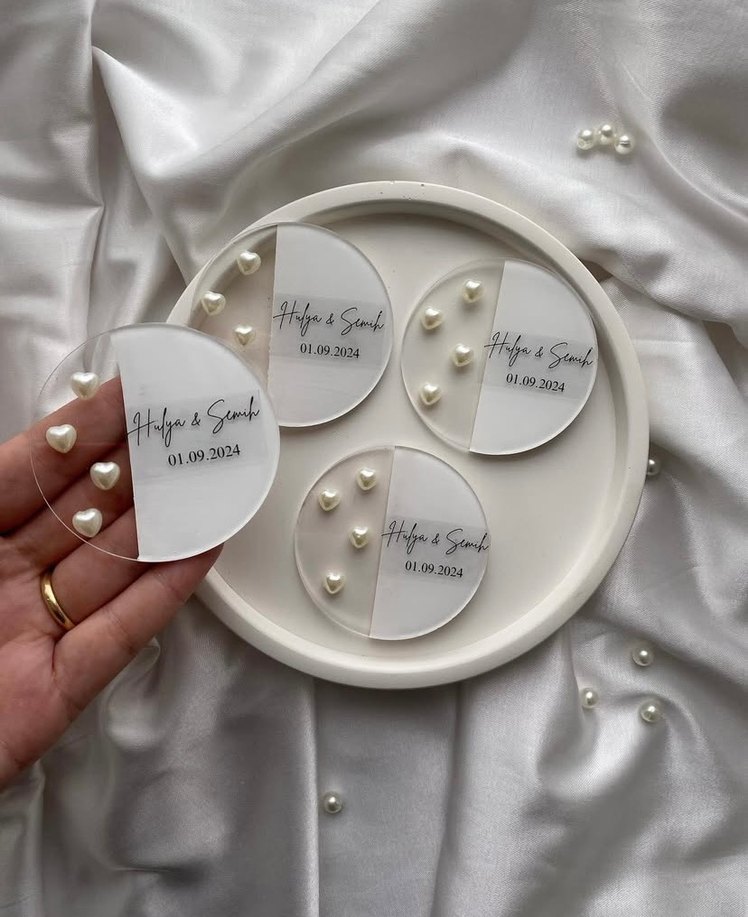 İsimler ve tarih yazılı, yarı şeffaf tasarımlı beyaz yuvarlak pleksi bardak altlıkları. Hediye olarak uygun.