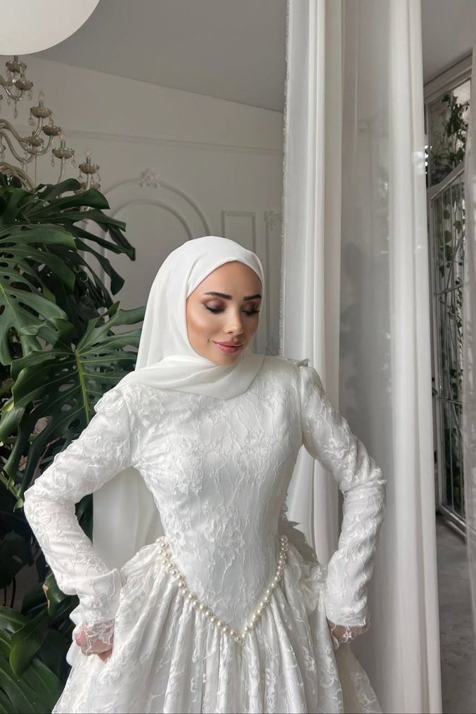 KİŞİYE ÖZEL DİKİM FİYATIDIR ABİYEDEN GELİNLİĞE İSTEDİĞİNİZ MODELİN ÖZEL DİKİMİ YAPILIR İşlemeli, yüksek yakalı ve uzun kollu beyaz tesettür gelinlik. İnci detaylı, drapeli tasarımıyla şık ve zarif bir görünüm sunar.
