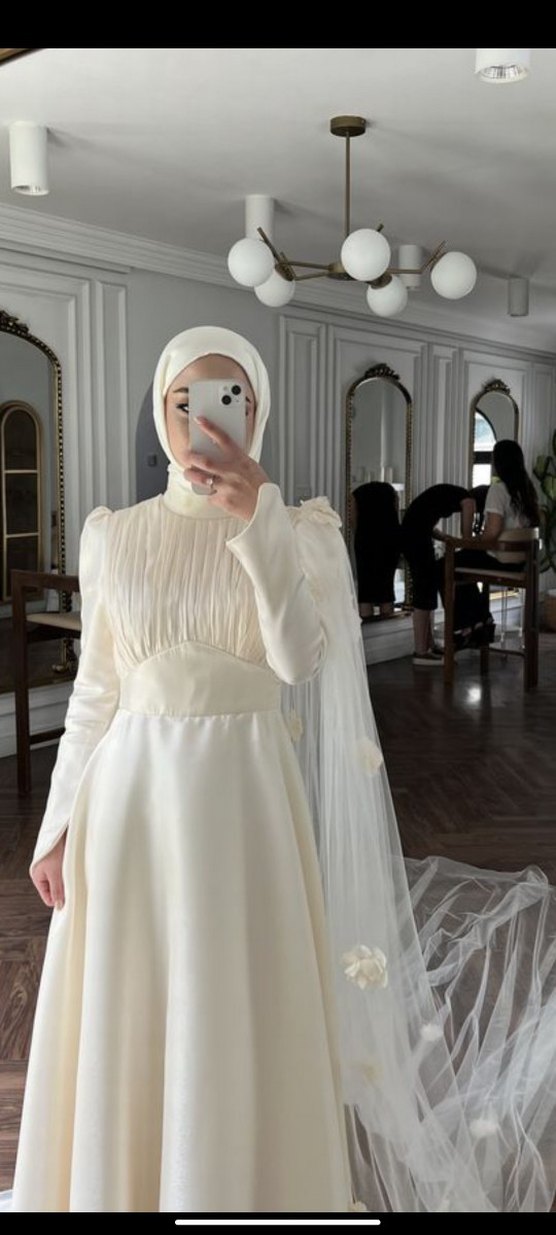 kişiye özel dikim fiyatdır istenilen değişiklikler yapılır abiyeden gelinliğe istenilen her modelin özel dikimi yapılır klasik tarzda, yüksek yakalı ve uzun kollu, drapeli yapıya sahip, minimal ve modest görünüm sunan beyaz gelinlik.