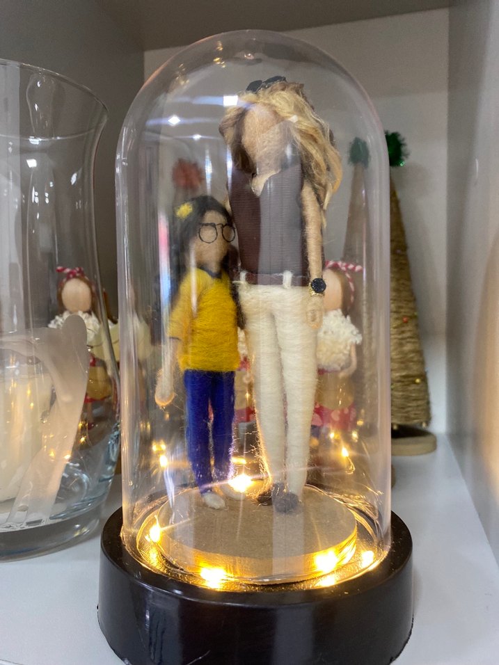 Bej renkte iki figürin, cam fanus içinde ve taban çevresinde sıcak ışıklı ledlerle sergileniyor. Figürinler farklı boylarda ve detaylı tasarlanmış. ️