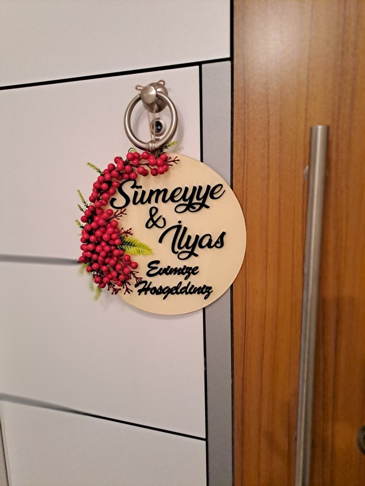 kokina çiçeğiyle süslenmiş kapı süsü kişiye özel tasarlanir renk ve yazi değişikliği mevcuttur