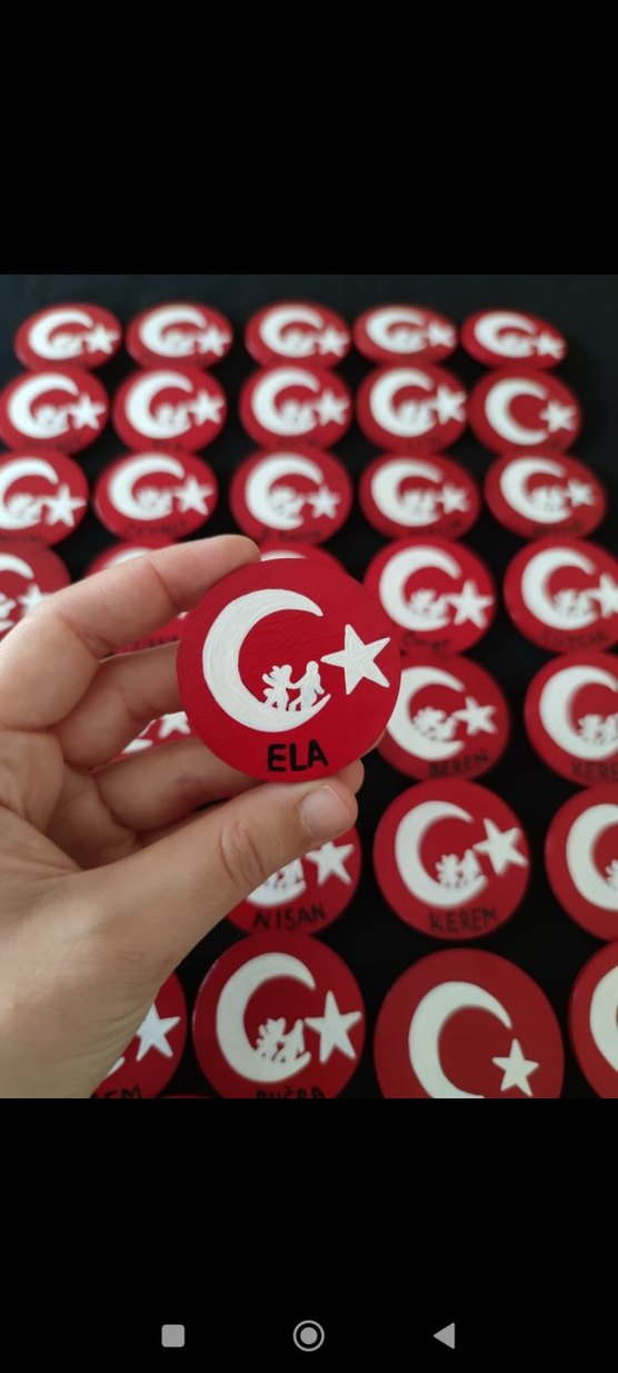her biri 5 cm çapında ham MDF üzerine akrilik boya ile boyanır ve verniklendi. arkasında iğnesi mevcuttur. ulusal günlerde törenlerde ve dilerseniz her zaman kullanabilirsiniz. çocuklara ya da kendine göre tercih edebilirsiniz. adet fiyatı 35 tl. #29ekim #cumhuriyetbayramı #10kasım #rozet #23nisan