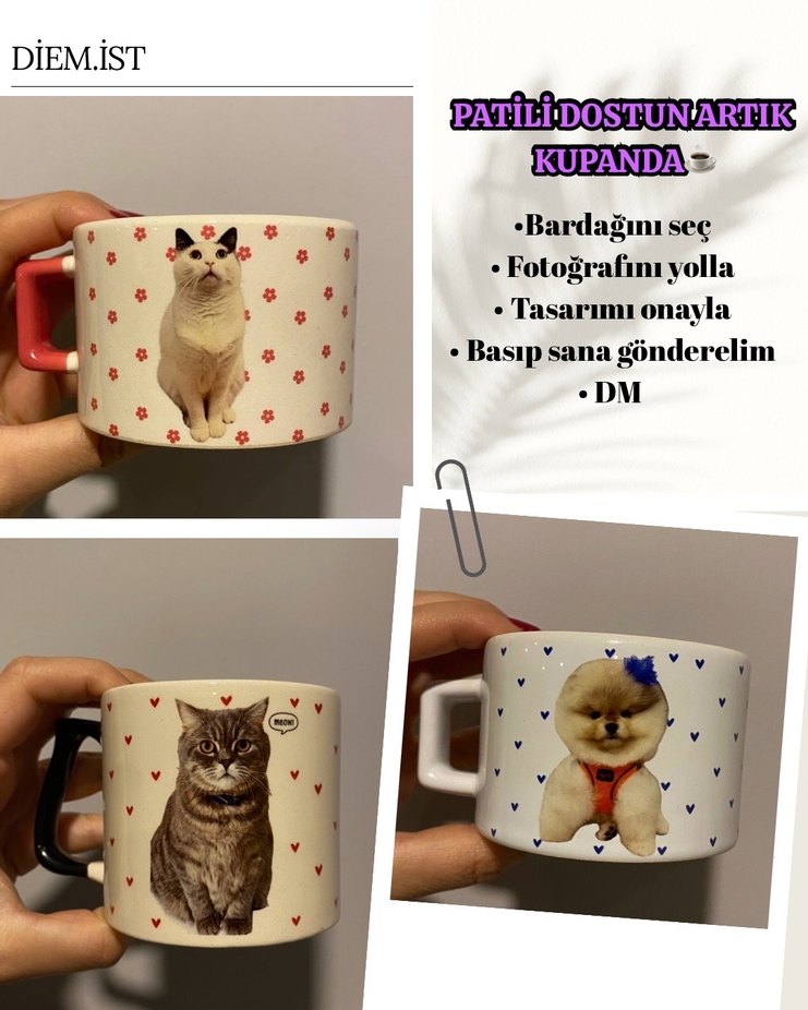 Beyaz pastel renkte, küçük kalp ve pati desenli, kişiye özel evcil hayvan fotoğrafı baskılı kupa bardaklar. Kupanı seç, fotoğrafını yolla, tasarımı onayla. ☕
