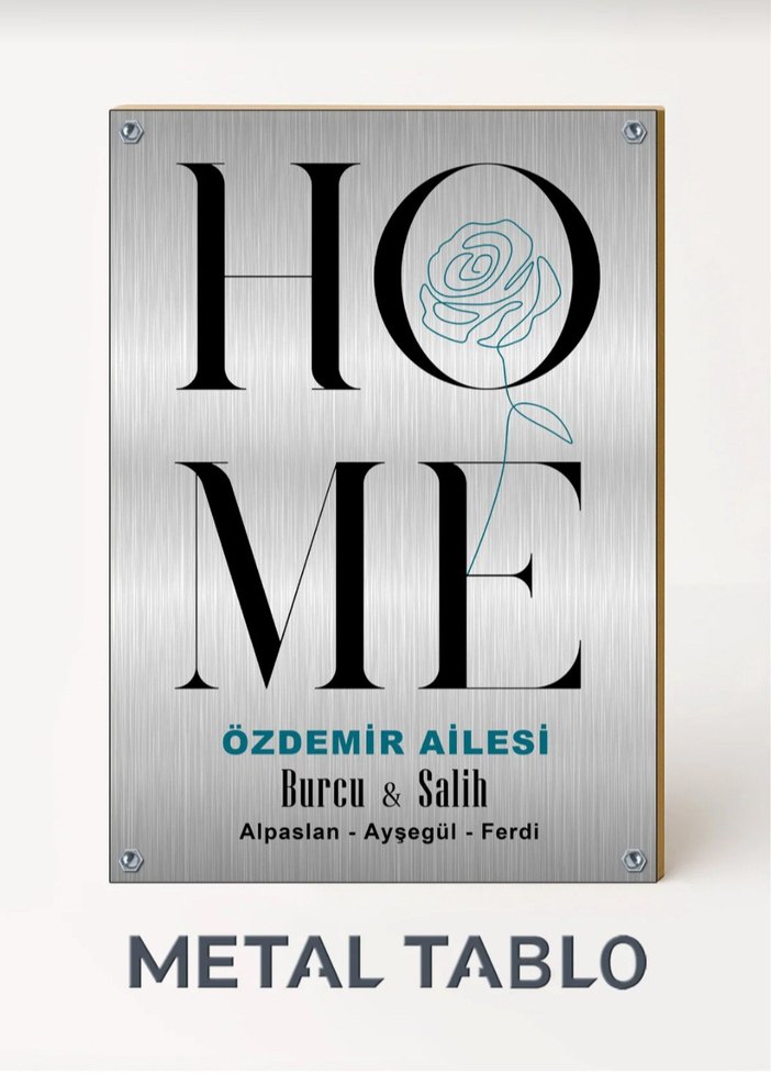 Gümüş fırçalanmış metal yüzeyde HOME yazısı ve gül deseni bulunan kişiye özel aile isimli tablo. Ürün Açıklaması Özel aparatı ile tasarımları kolaylıkla masa üzerinde kullanabilirsiniz. Ürün hem masa üzerinde hem de duvara asarak kullanılabilir. Tasarımlar parlak yüzeyli, yüksek kaliteli, ChromaLuxe® alüminyum üzerine basılmıştır. Metal baskılarımız, çizilme ve aşınmaya karşı dayanıklı, çarpıcı ve dayanıklıdır. Metal üzerine yapılan bu özel baskılar, en sevdiğiniz anıları birlikte hatırlayabilmeniz için arkadaşlarınıza, ebeveynlerinize verilecek anlamlı bir hediyedir. Resimlerinizi raflarda, masalarda yada duvarda sergilenmeye hazır, göz alıcı metal fotoğraf baskılarına dönüştürmek çok kolay.