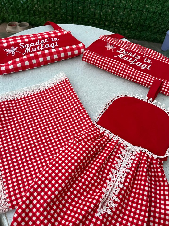 Nakışlı desenlere ve ince dantel detaylara sahip kırmızı mutfak önlüğü. Klasik kareli tasarım ve kişiye özel nakış içerir. Su geçirmez kumaş