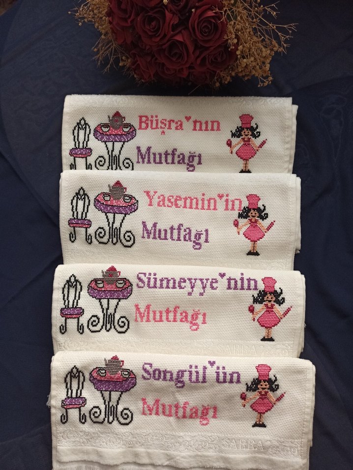 Koyu pembe renkli, kişiye özel isim işlemeli, mutfak temalı desenlere sahip baskılı mutfak havlusu. Geleneksel tarzda, dekoratif motiflerle süslenmiştir. ️