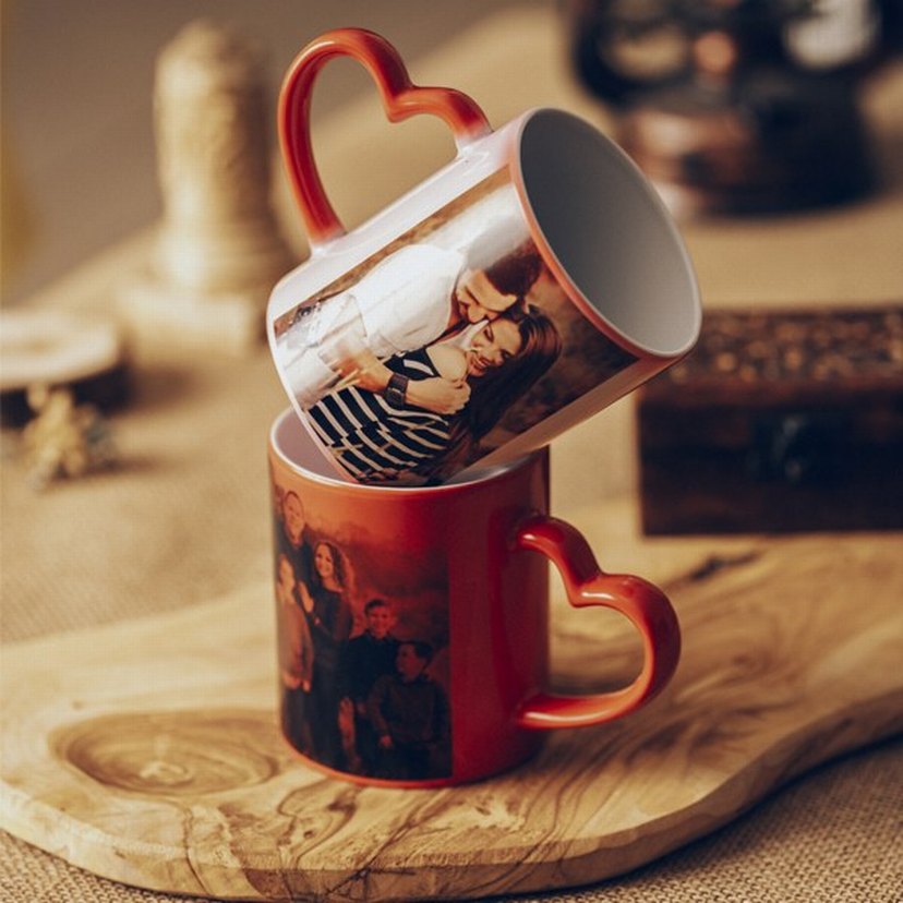 Kişiye özel fotoğraflı, kırmızı kalp kulplu kupalar. Anılarınızı yansıtırken içeceğinizi keyifle yudumlayabilirsiniz. ❤️ SİHİRLİ KUPA BARDAK
