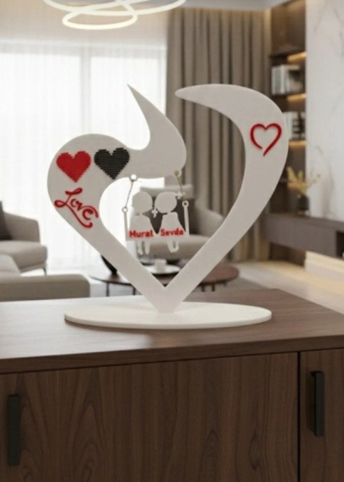 Kişiye özel isimli sallanan çift figürlü, kırmızı ve siyah detaylı beyaz kalp şeklinde aşk temalı dekor. ❤️