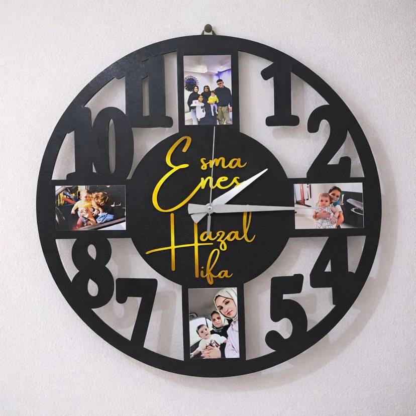Büyük sayılar ve dört fotoğraf çerçevesi bulunan siyah duvar saati, sarı yazı tipiyle isimlerle kişiselleştirilmiş, zamanı ve anıları birleştiriyor .
