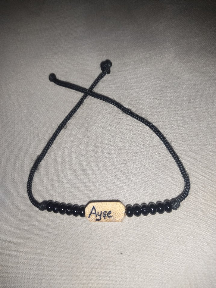 Ayşe yazılı isim plakalı, siyah minimalist bileklik. Ayarlanabilir ip ve küçük boncuklarla sade bir tasarım sunar.
