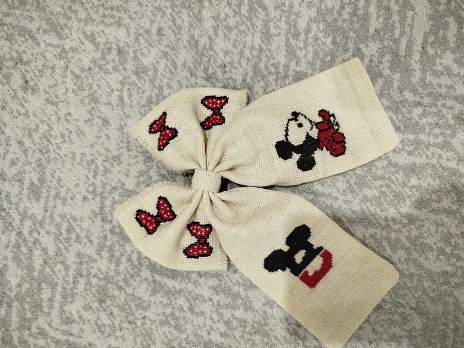 Nakışlı kırmızı fiyonk ve çizgi film desenleriyle saç tokası, bohem tarzında.