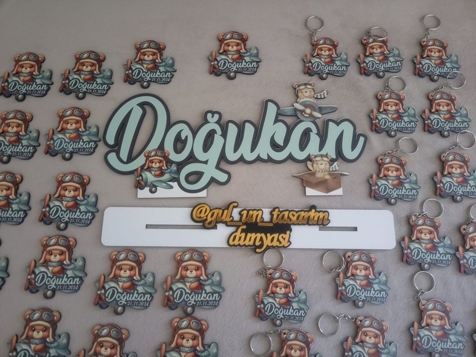 Gri ve kahverengi tonlarda, Doğukan ismi ve tarihi bulunan, çizgi film pilot temalı kişiye özel anahtarlık ve dekor seti. ️ 1 masa üstü isimlik 350 ₺ magnet 18 Anahtarlık 20