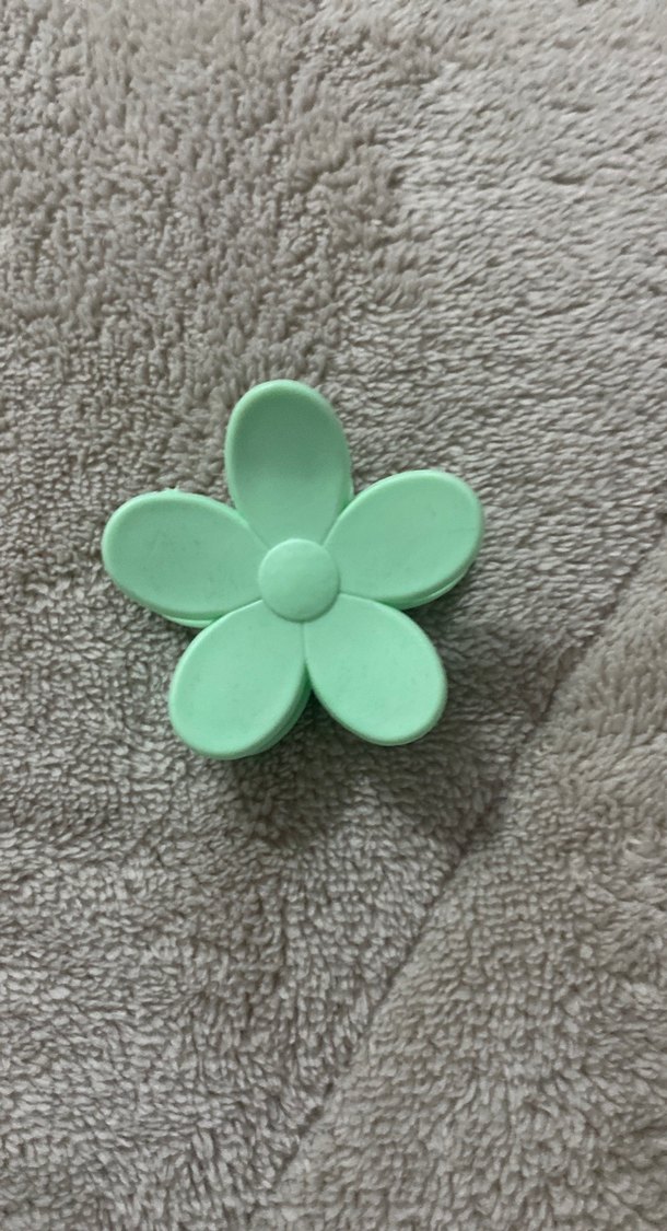 Düğmeli ortası olan pastel yeşil plastik çiçek, sade ve minimalist tarz için uygun bir saç aksesuarıdır.