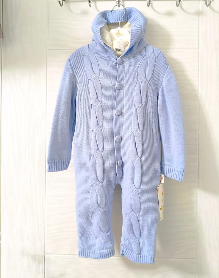 Pastel mavi renkli, örgü dokulu erkek bebek tulumu. Kapüşonlu ve düğmeli, yumuşak örme kumaştan üretilmiştir.