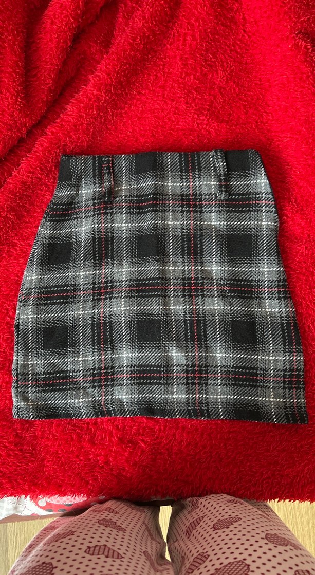 Kışlık, gri ekose desenli bu dar kesim mini etek, kırmızı çizgilerle ve yumuşak dokusuyla dış mekan kullanımı için rahat ve gotik bir stil sunar.