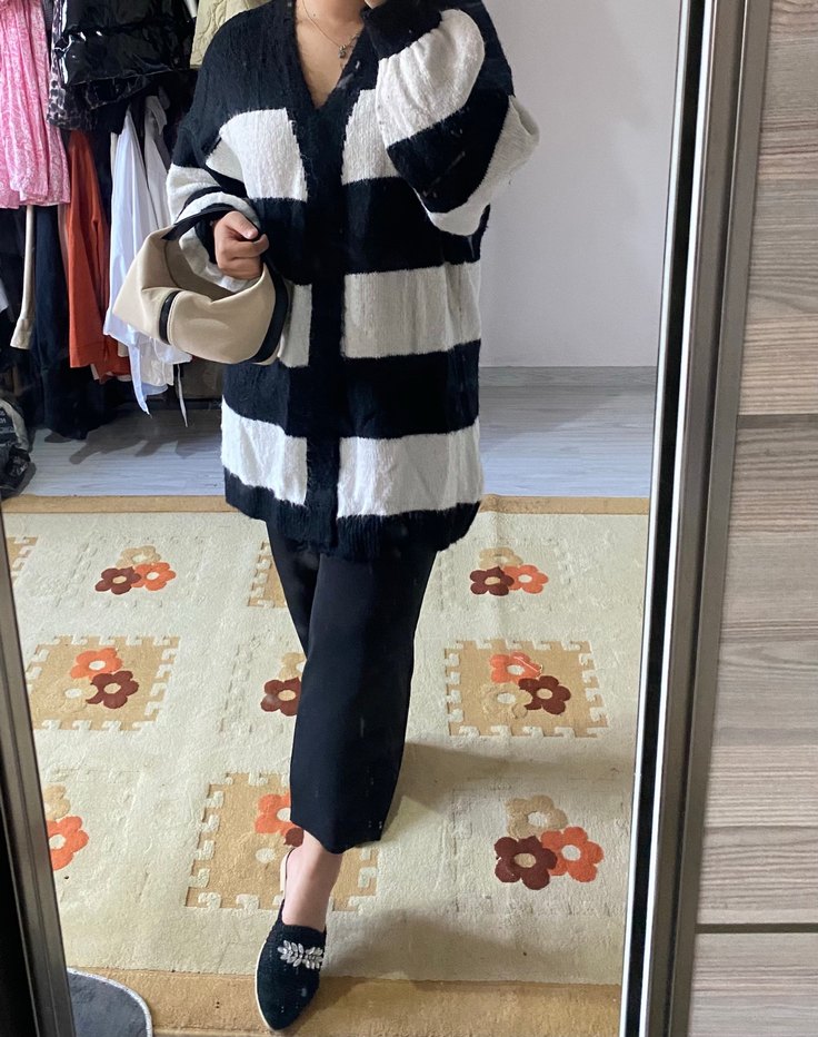 Uzun, bol kesim, boğazlı ve zebra desenli örme kadın hırka. Günlük rahat kullanıma uygun.