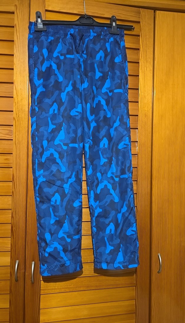 Erkek çocuklar için koyu mavi kamuflaj desenli, bol kesim, içi polarlı kışlık pantalonSentetik kumaştan, trend sokak stili için uygundur.