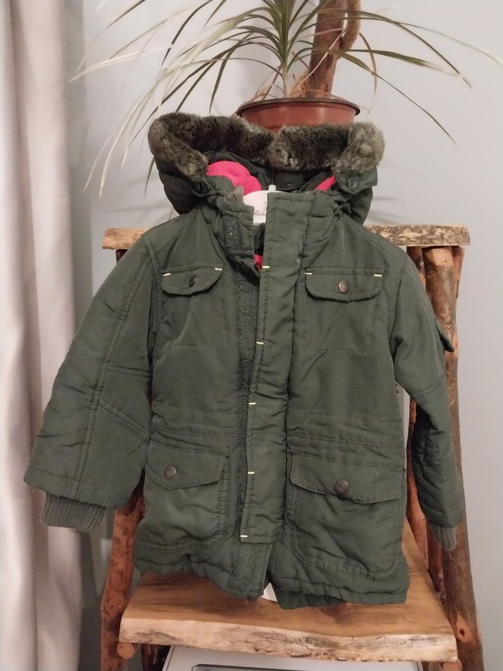 çocuk montu, kürklü kapüşon ve kürk kısmı dugmelidir, cikarilabilir. Yumuşak ve sıcak tutan koyu yesil kumaştan üretilmiştir. ❄️ blue zoo marka. ici polarli ve puff.