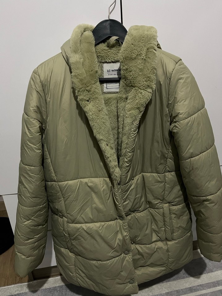 Bej renkli, kürklü detaylı, uzun kollu, notched lapel yaka ve fitted kesime sahip kadın kışlık mont. Yumuşak ve sıcak fleece kumaştan, midi boyda, dış mekan kullanımı için uygundur. ❄️ etiketinde yaş aralığı yazıyor fakat ben 50-55 kiloda giydim 1 kez kullandım