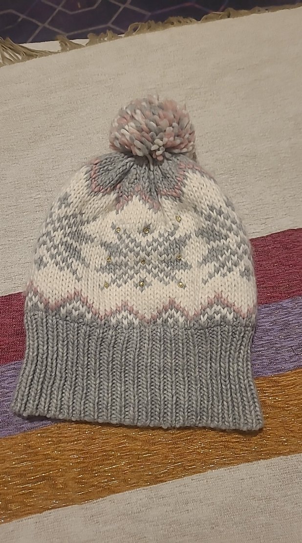 Gri ve yumuşak pembe tonlarda desenli, ponponlu kadın bere. Rahat ve çocuksu tarzda, sıcak tutar. İngiltere New Look mağazasından alındı.