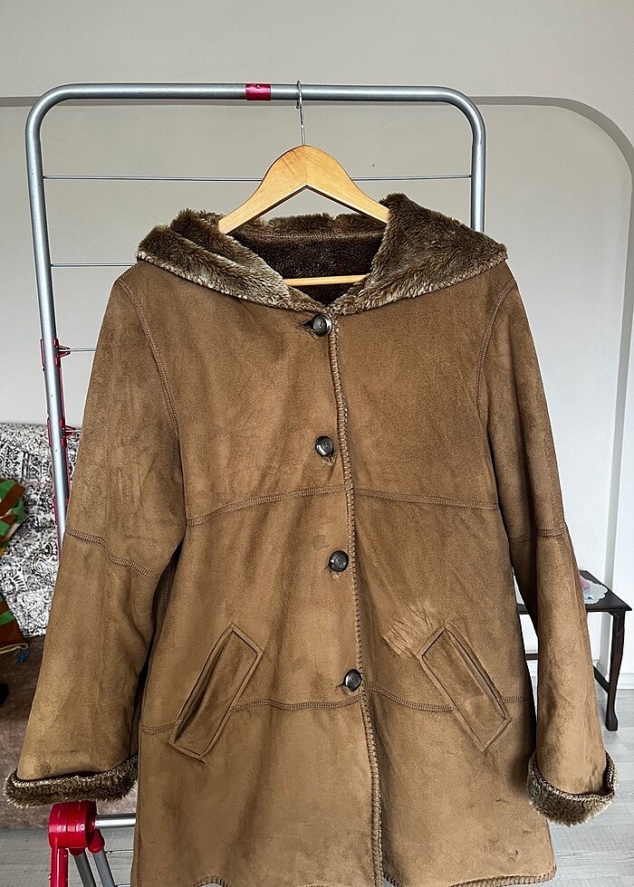 İçi yapıda, dışı süet, düğmeli ve kapüşonlu kahverengi kaban. Kumaşı oldukça kalın, kışın giymelik. İçi yumuşacık. Sürtünme kaynaklı neredeyse gözükmeyen ufak bir defosu mevcuttur, onun dışında hiçbir kusuru yoktur. Fotoğraflarda mevcuttur. S beden. Marka temsilidir.