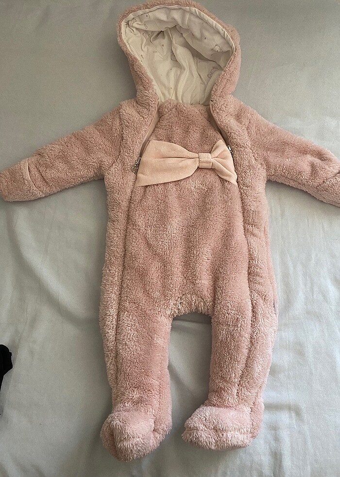 Fermuarının birinin süsü yok. Şapkasının iç kısmında hafif sarılık ver. Bacak arası ağ kısmında siyahlık var açılmaya bağlı. Hepsi fotoğraflarda mevcut. 6-9 ay.