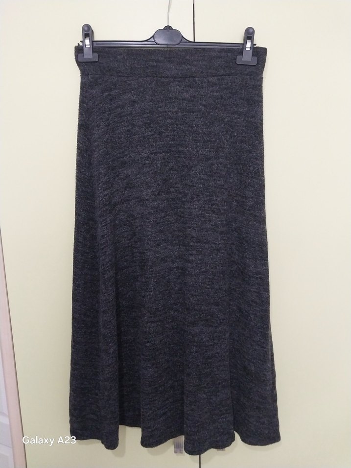 Gri midi uzunluğunda, örgü dokulu, bol kesim kadın etek. Yumuşak sentetik kumaştan yapılmış, günlük rahatlık için uygundur. Desensiz ve sade tasarıma sahiptir.