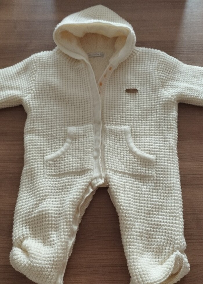 Baştan sona çıtçıtlı, yünlü bebek tulum. Sıcacık tutan bir ürün. Çok az kullanıldı yepyeni duruyor. Hiçbir deformesi yok. 9-12 aya uygun. Markası Monna Rosa
