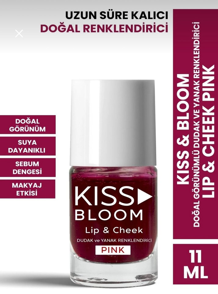 Kiss Bloom Lip & Cheek pembe renk, uzun süre kalıcı, suya dayanıklı ve sebum dengesi sağlayan doğal görünümlü dudak ve yanak renklendiricisidir. 11 ml. Hiç açılmadı