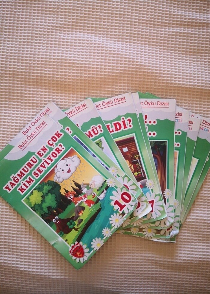 İlk okuma kitabı 10 adet ilk kitaplar renkli heceli. Alt uçları kıvrılmış. Yırtık yok