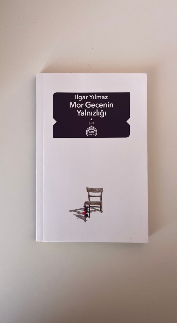 Ilgar Yılmaz'ın "Mor Gecenin Yalnızlığı" adlı şiir kitabı, sade kapak tasarımı ve tek bir sandalye ile gül görseli içerir.