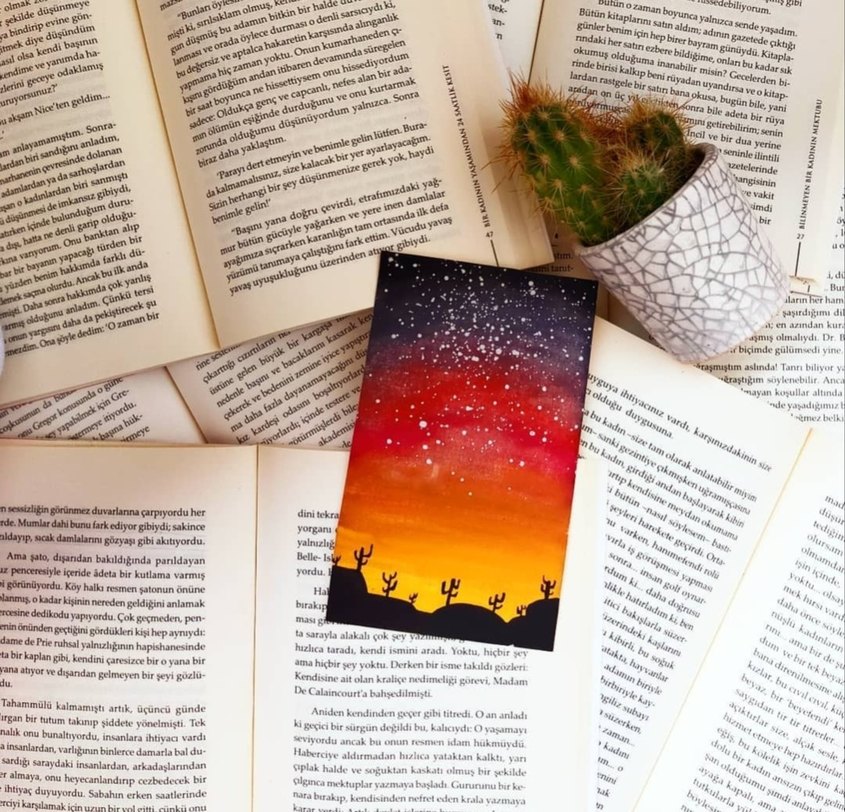 Yıldızlı gece altında kaktüs silüetleriyle renkli gökyüzü tasarımlı çizim. 3 adet bulunmakta.