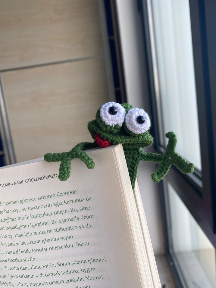 Renkli yeşil örme kurbağa peluş oyuncak, kitap tutucu olarak kullanılır. Yumuşak ve eğlencelidir, okuma zamanına neşe katar.