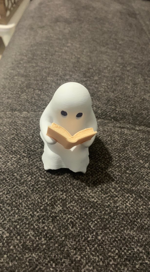 Düz yüzeyli, kitap okuyan küçük beyaz hayalet figür. Dekoratif amaçlı kullanılabilir.