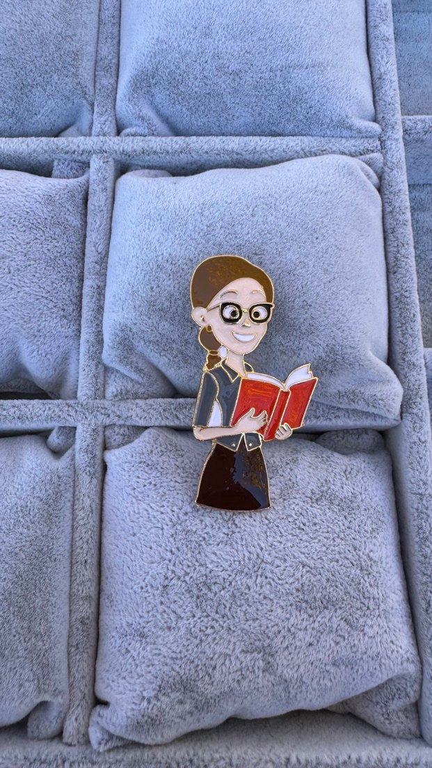 Gözlüklü bir kızın kırmızı kitap okuduğu renkli emaye rozet. Hikayelere olan sevgiyi yansıtıyor.